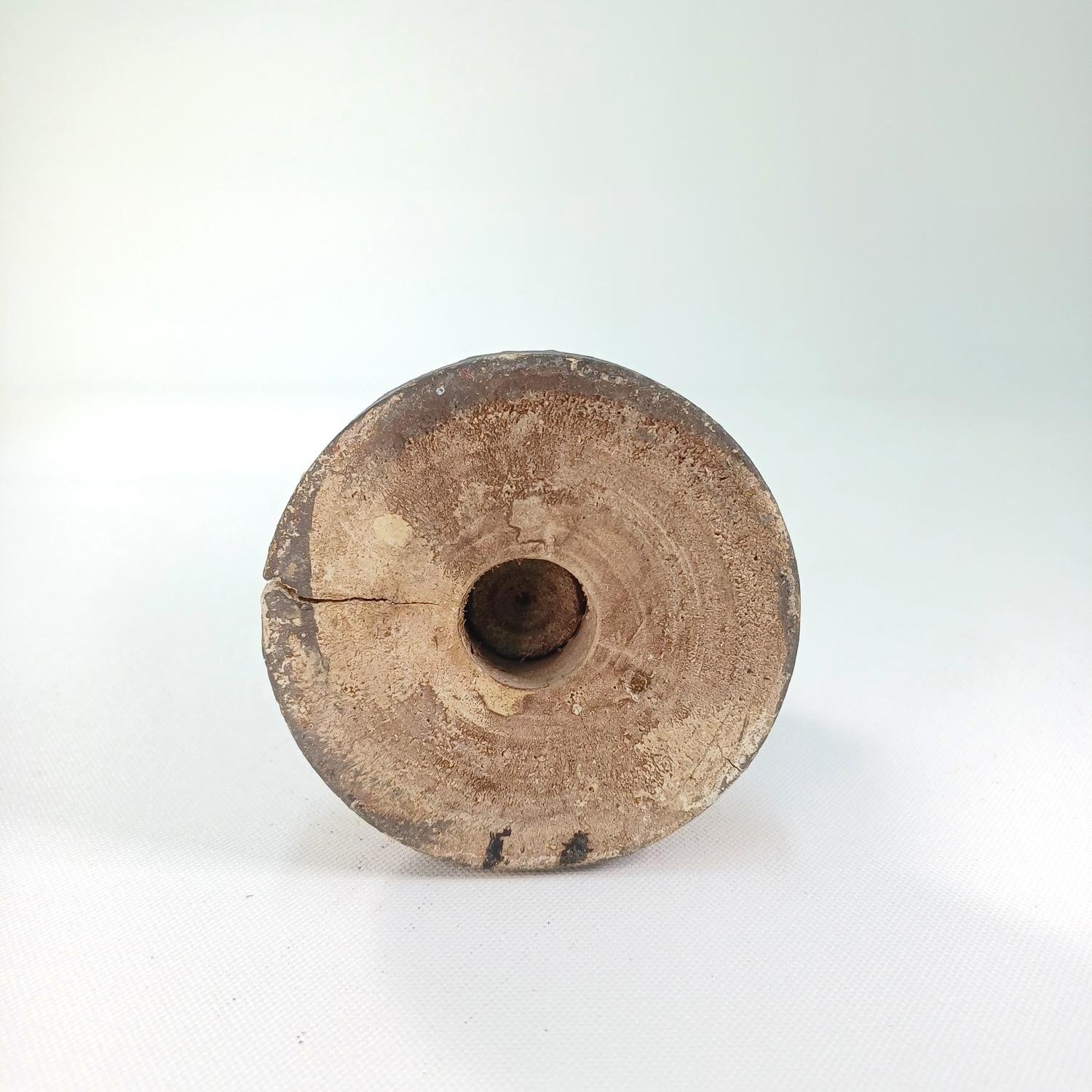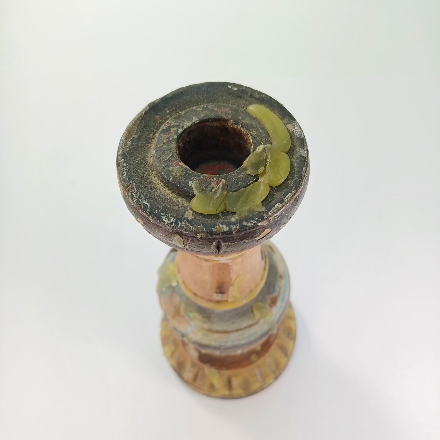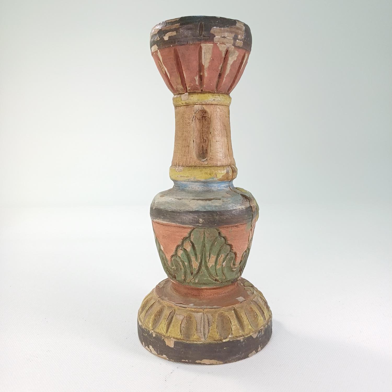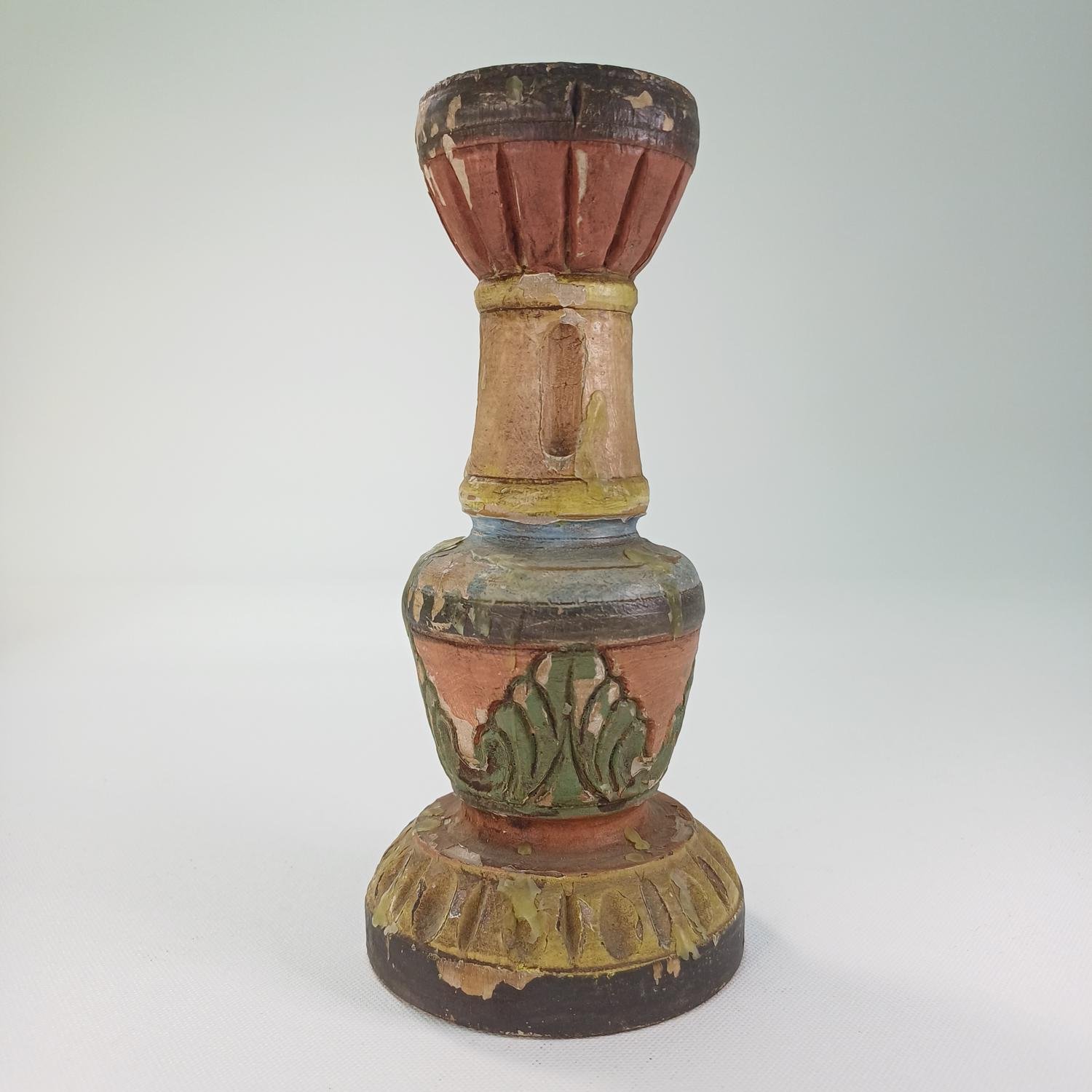 Ξύλινο κηροπήγιο vintage, ζωγραφισμένο στο χέρι. Έχει ύψος 18 cm και διάμετρο βάσης 8 cm. Υπάρχουν φθορές στο χρώμα του καθώς και σκασίματα στο ξύλο λόγω παλαιότητας.